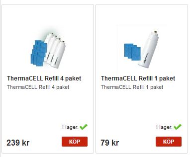 När en Thermacell köps följer det med en patron och tre myggmedelsplattor. Detta innebär att man har myggskydd i ca 12 timmar. Här kan du köpa refill till Thermacell med antingen 4-paket eller 1-paket. Med andra ord för 12 timmars skydd eller 48 timmars.